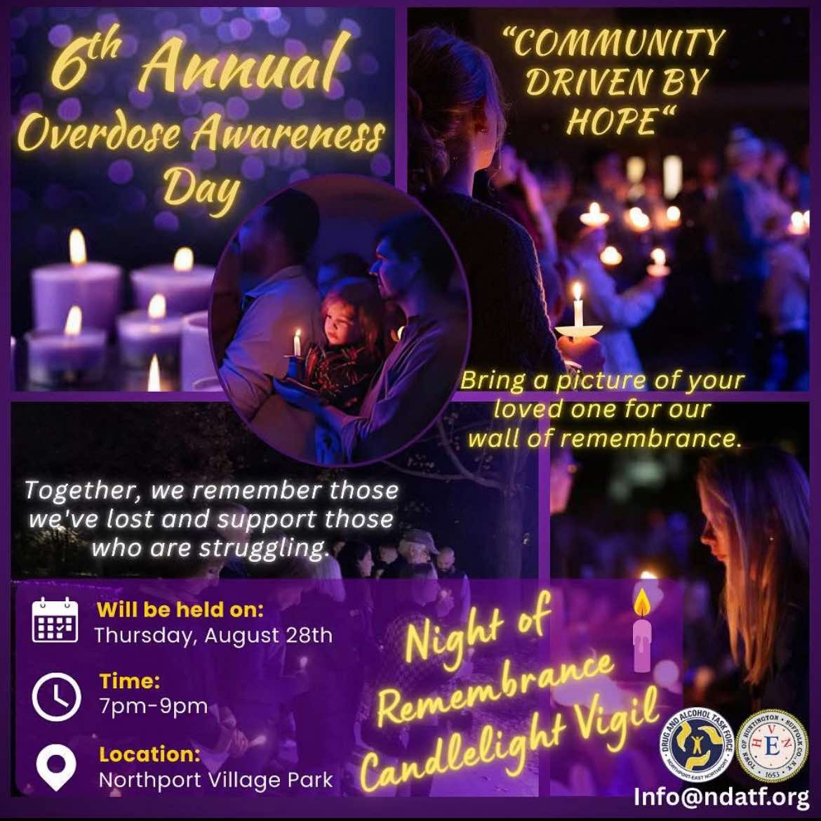 “TONIGHT Overdose Awareness Day NIGHT OF REMEMBRANCE Candlelight Vigil in Northport. Have you lost a friend or loved one to overdose? WE HAVE… When we stand together in this shared space holding a memorial flame to acknowledge and honor the PRECIOUS and BELOVED lives of those who have passed away, we are enveloped with a deep and profound PEACE in COMMUNITY despite the sadness. I can’t explain it well… it’s something you just have to experience to understand. No words required. The unseen is palpably SEEN and FELT and we are LOVED for being there in a unique way that brings hope and some healing for those of us left behind. It’s not a club that anyone wants to join, but most of us are members as we all know someone. If this resonates with you on any level, we officially invite you to come find us – Dana Elliott Richter and June Hunt Margolin. We can use a hug, and we have many to give out too. Bring a photo of your loved one(s) to be added to the Memorial Board. You are not alone. Wear purple if you can. IF YOU ARE STRUGGLING with substance abuse or addiction, PLEASE COME to be supported and encouraged, and connected to many resources to help you overcome. YOUR LIFE IS PRECIOUS and YOU ARE LOVED – even by complete strangers.” – June Margolin, August 28, 2025, Huntington Matters & Huntington Matters Community Forum Facebook Post.