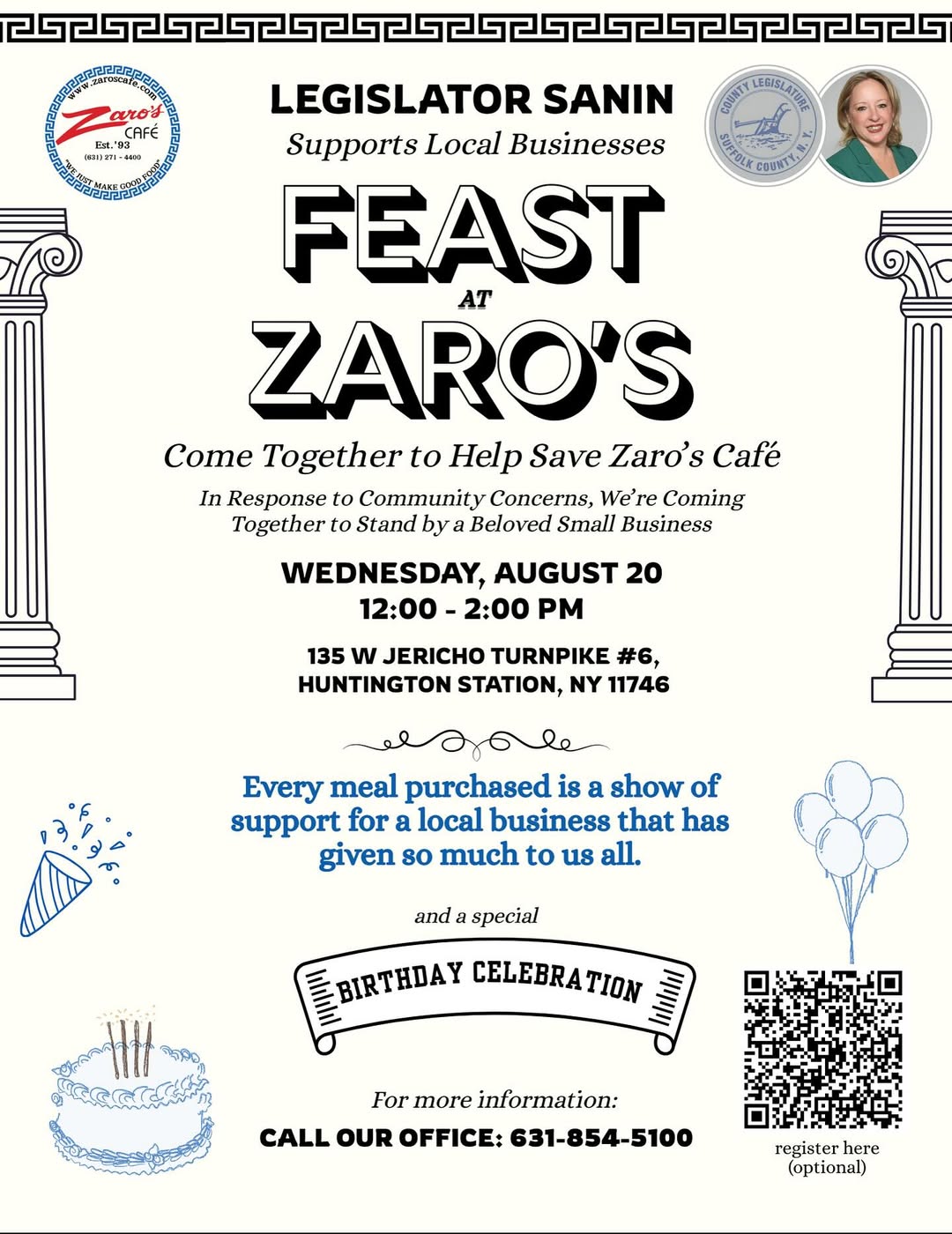 After learning that the business was struggling, Suffolk County Legislator Rebecca Sanin, true to her commitment to helping others, invited the community to come together during a “Feast at Zaro’s” event. The flyer read “Come together to help save Zaro’s Cafe” – purchase a meal, enjoy the warm atmosphere, and stand in solidarity with Zaro’s Cafe during this challenging time. “Every meal purchased is a show of support for a local business that has given so much to us all.”