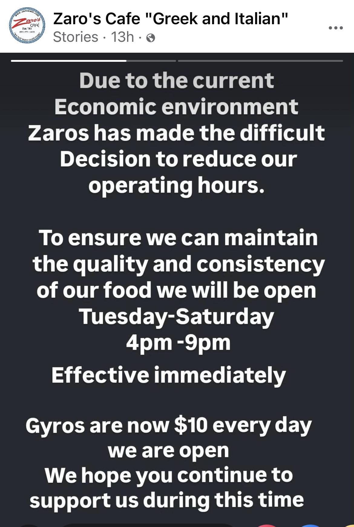 On July 17th, Zaro’s Cafe posted the following statement on their Instagram stories: “Due to the current economic environment Zaros has made the difficult decision to reduce our operating hours. To ensure we can maintain the quality and consistency of our food we will be open Tuesday-Saturday 4pm-9pm effective immediately. Gyros are now $10 every day we are open. We hope you continue to support us during this time.”