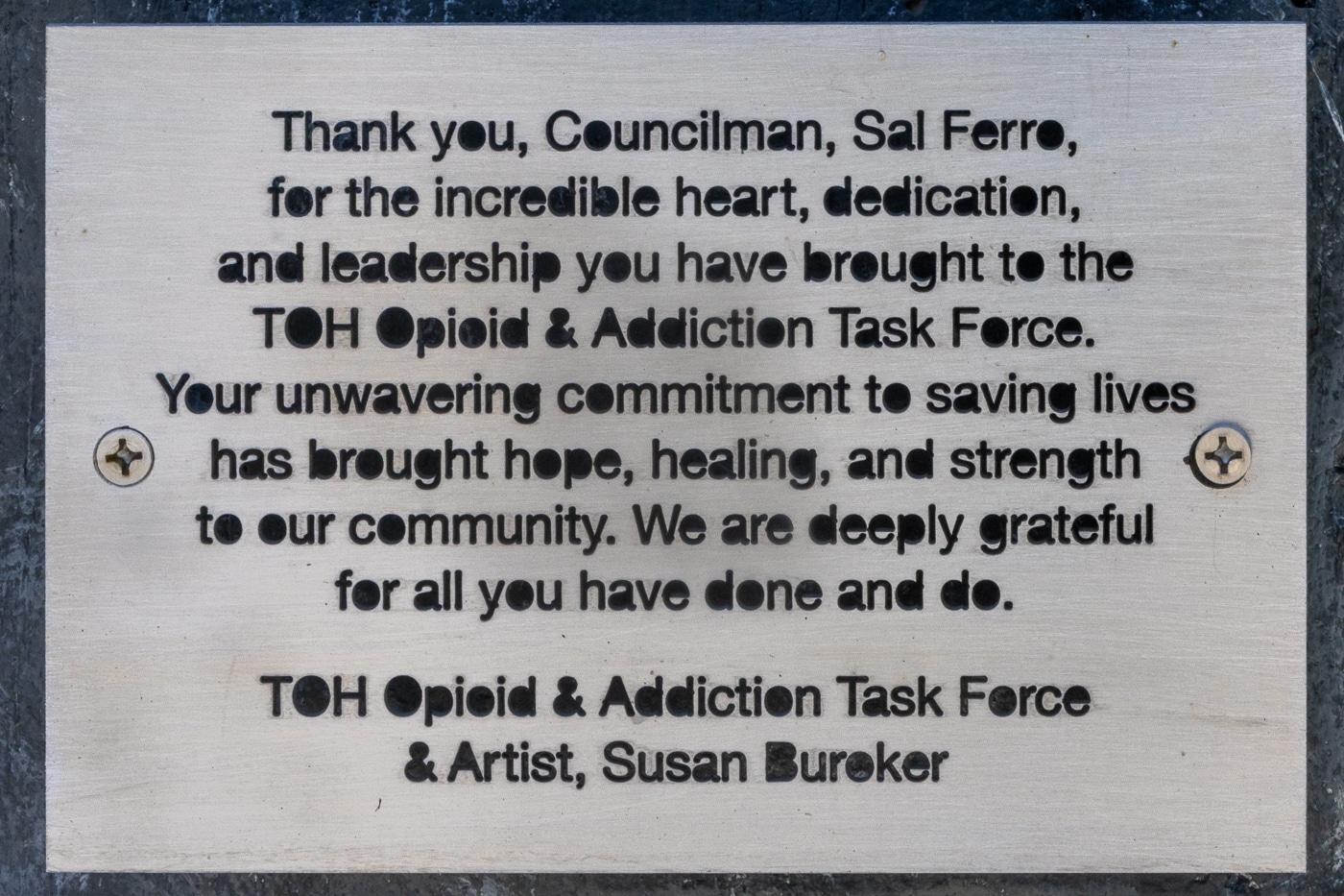 Following remarks from town officials, task force members, and a blessing by Pastor Means, a plaque was presented honoring former Town of Huntington Councilman Sal Ferro for his dedication to addressing addiction in the community. His work was recognized as part of Huntington’s efforts around awareness, prevention, and recovery.