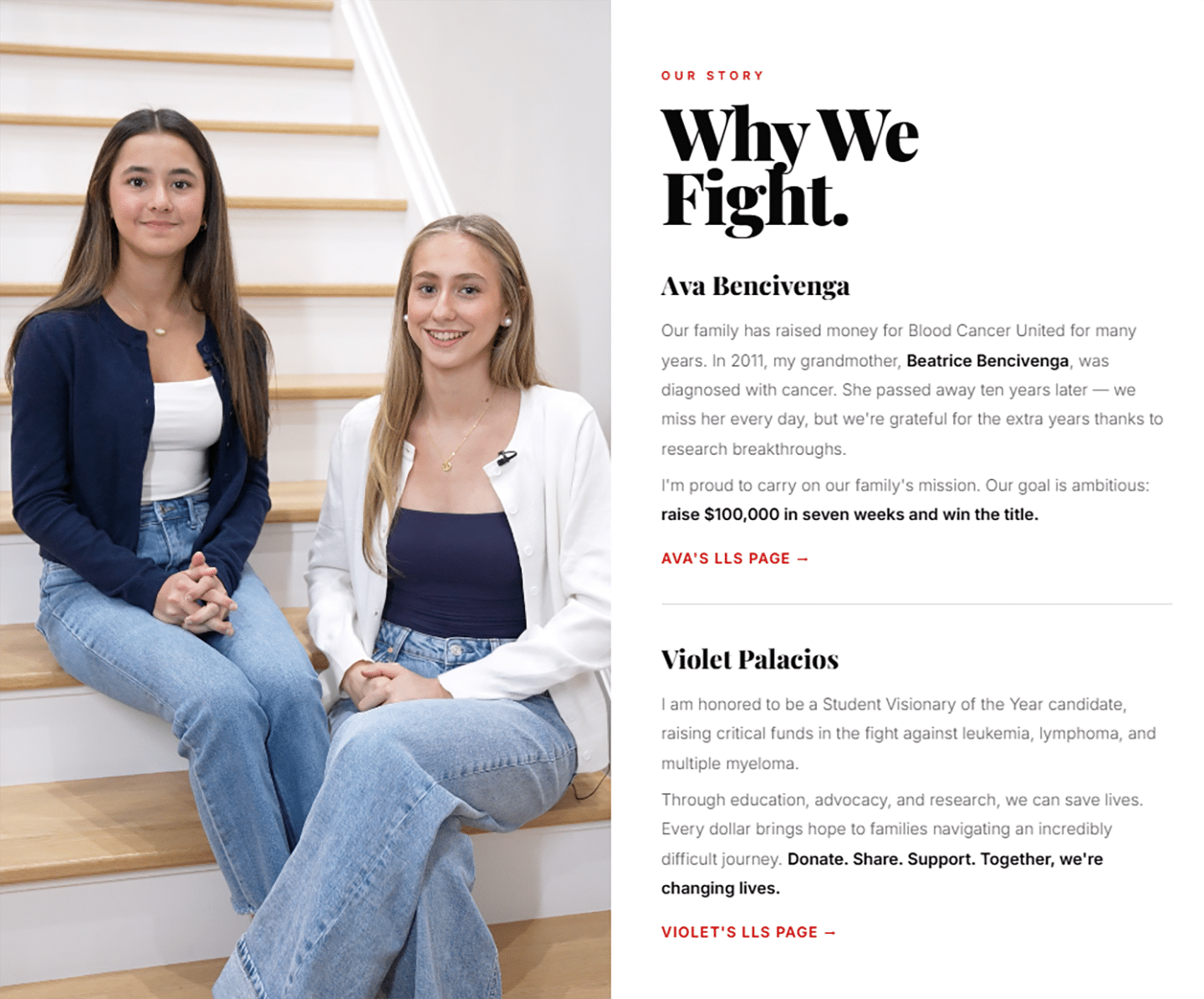 Fifteen-year-olds Violet Palacios and Ava Bencivenga are leading a fundraising campaign aiming to raise $100,000 for families affected by blood cancers through the Student Visionaries of the Year program run by Blood Cancer United.