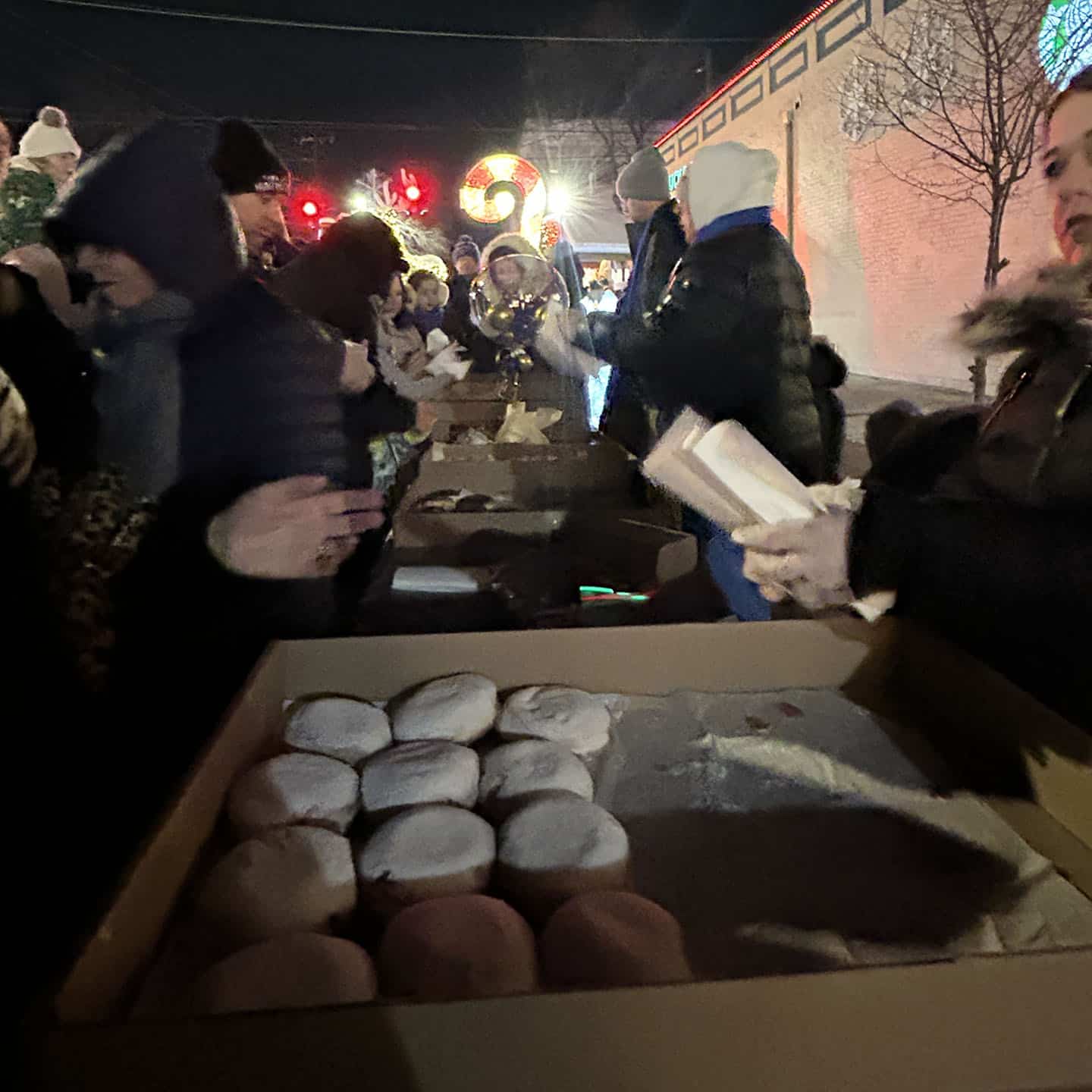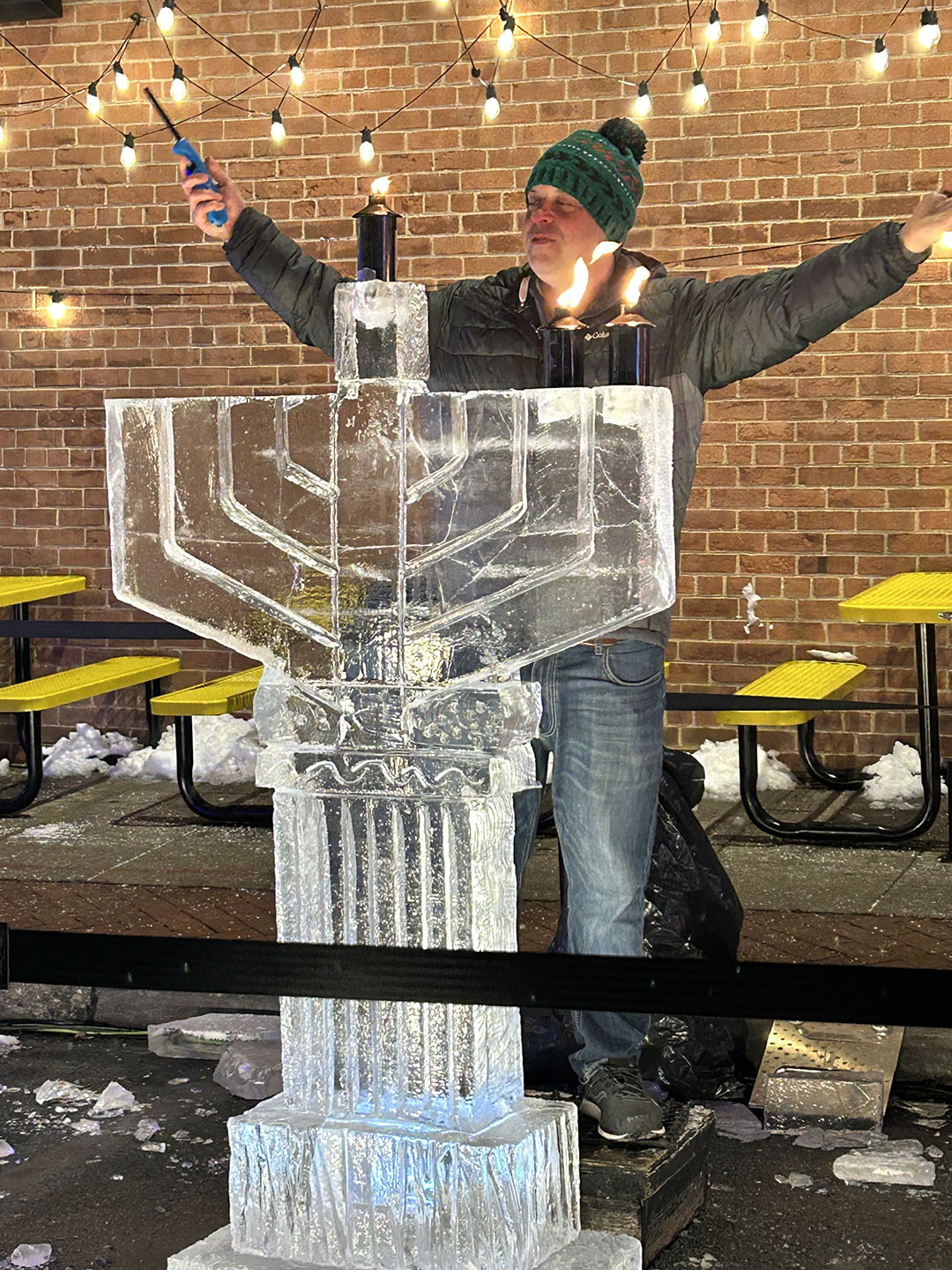 Following the candle lighting, families stayed to enjoy jelly donuts, hot chocolate, music, and an ice carving demonstration. The Huntington Fire Department added a special touch, delighting children by distributing chocolate gelt from their fire truck.