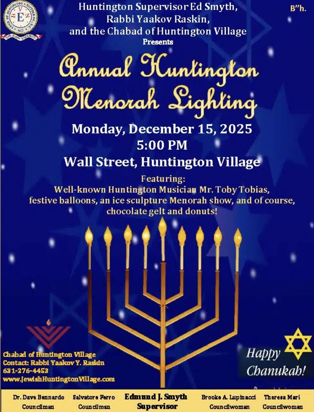 The evening was made possible through the collaboration of local leaders, organizations, and volunteers. Thanks were extended to Rabbi Yaakov Raskin of Chabad of Huntington Village, Town officials, public safety personnel, and event partners including Northwell Health Huntington Hospital.