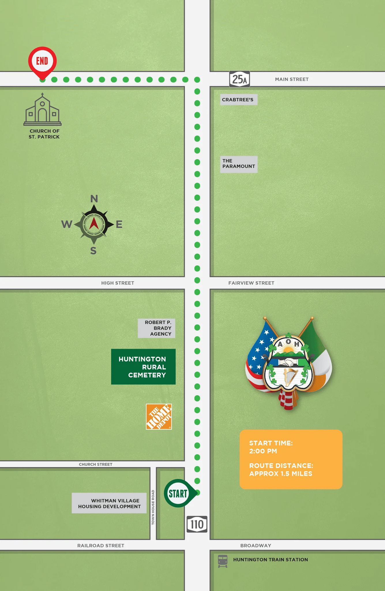 Parade Route: Start at the LIRR Commuter Parking Lot on New York Avenue, Huntington Station. Traveling North on New York Avenue, making a Left on Main Street, Ending at the Church of St. Patrick, 400 Main Street, Huntington.