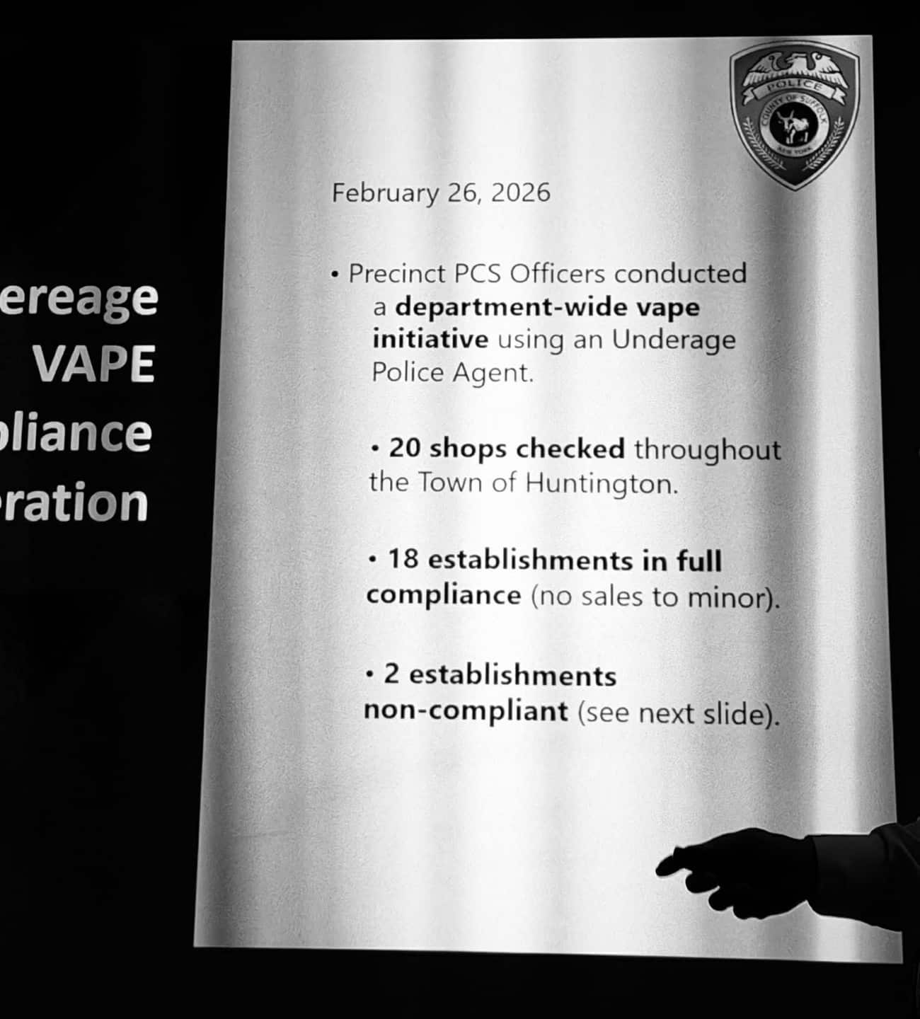 🚭 VAPE SHOP COMPLIANCE CHECKS at 20 shops. 2 Non-compliant: Danny’s Convenience Store and Joe Joe’s Convenience, Huntington Station. 2 Arrests made.