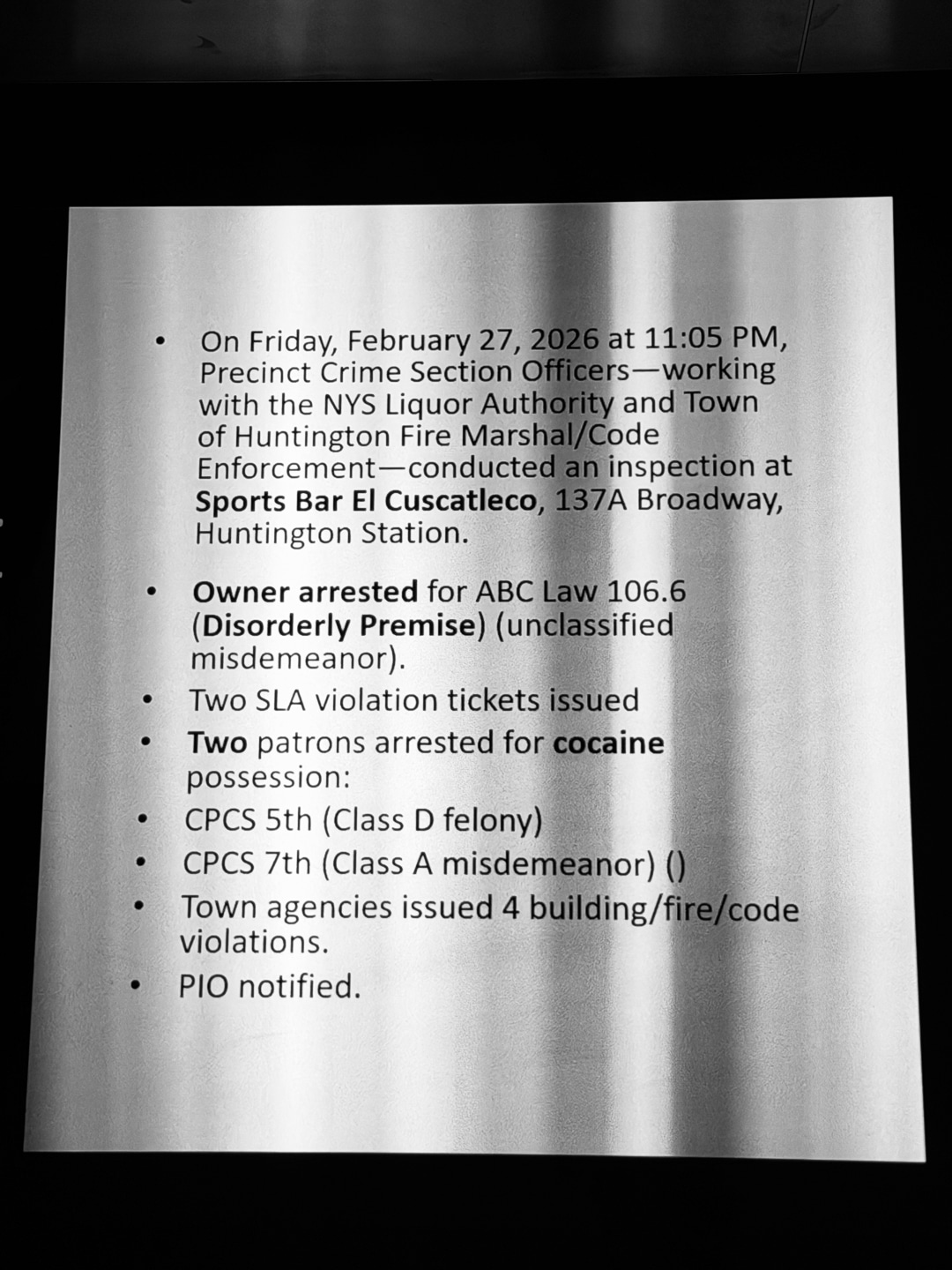 🚓 STATE LIQUOR AUTHORITY (SLA) INVESTIGATION WITH TOWN at Sports Bar El Cuscatleco, 137A Broadway, Huntington Station. 3 Arrests made – Owner & 2 Patrons (Cocaine Possession). 4 Violations.