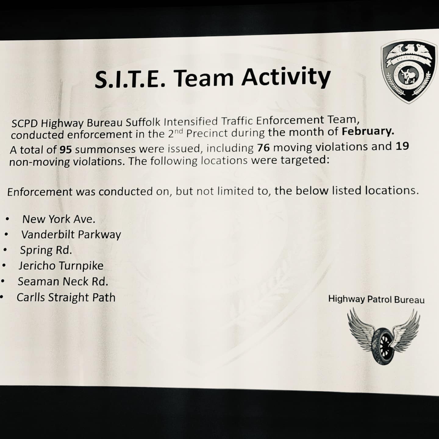 🚓 SITE TEAM TRAFFIC ENFORCEMENT in February – Visited 6 locations of concern and issued 95 summonses.