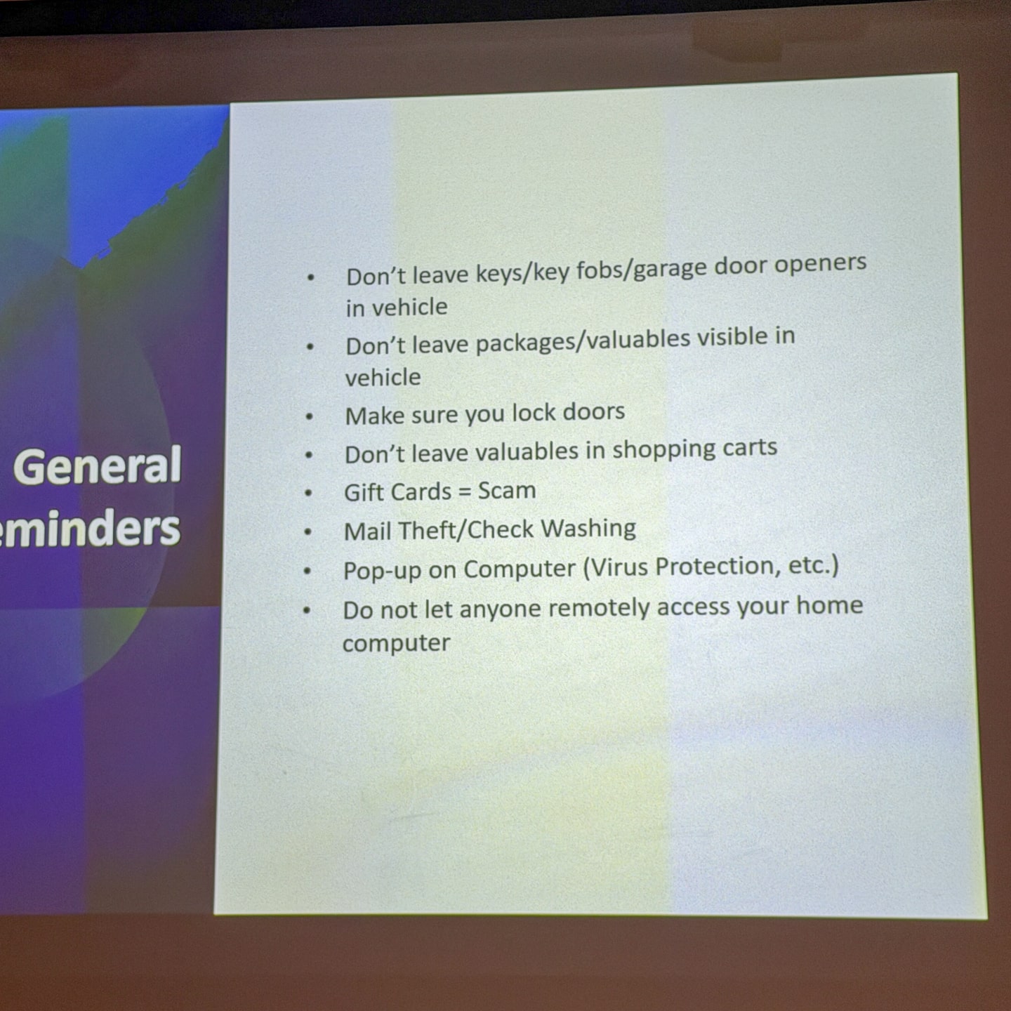 🚓 REMINDERS TO STAY SAFE: Lock your doors. Don’t leave valuables in the car. Don’t leave keys in the car. Don’t leave valuables in shopping carts. Set video devices to record and check them regularly.