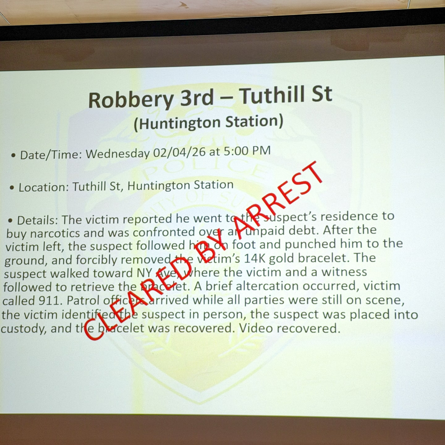 🚓 ROBBERY 3RD on Tuthill St, Huntington Station. Victim owed money to a drug dealer. Was punched and gold bracelet stolen. ARREST MADE.
