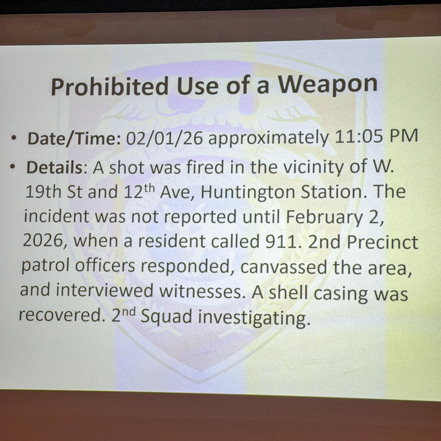 🔫 PROHIBITED USE OF A WEAPON on W. 19th Street and 12th Avenue, Huntington Station. Shell casing was found the next day when the incident was reported.