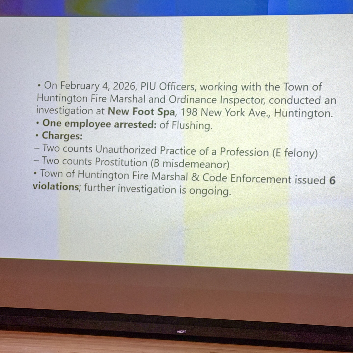 🚓 MASSAGE PARLOR ARRESTS with Town of Huntington –New Foot Spa, 198 New York Avenue, Huntington. 1 Arrest made, 6 Violations.
