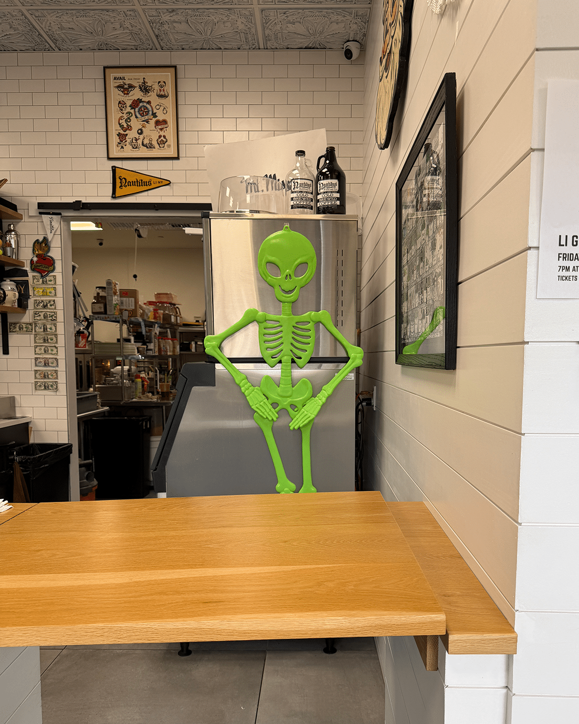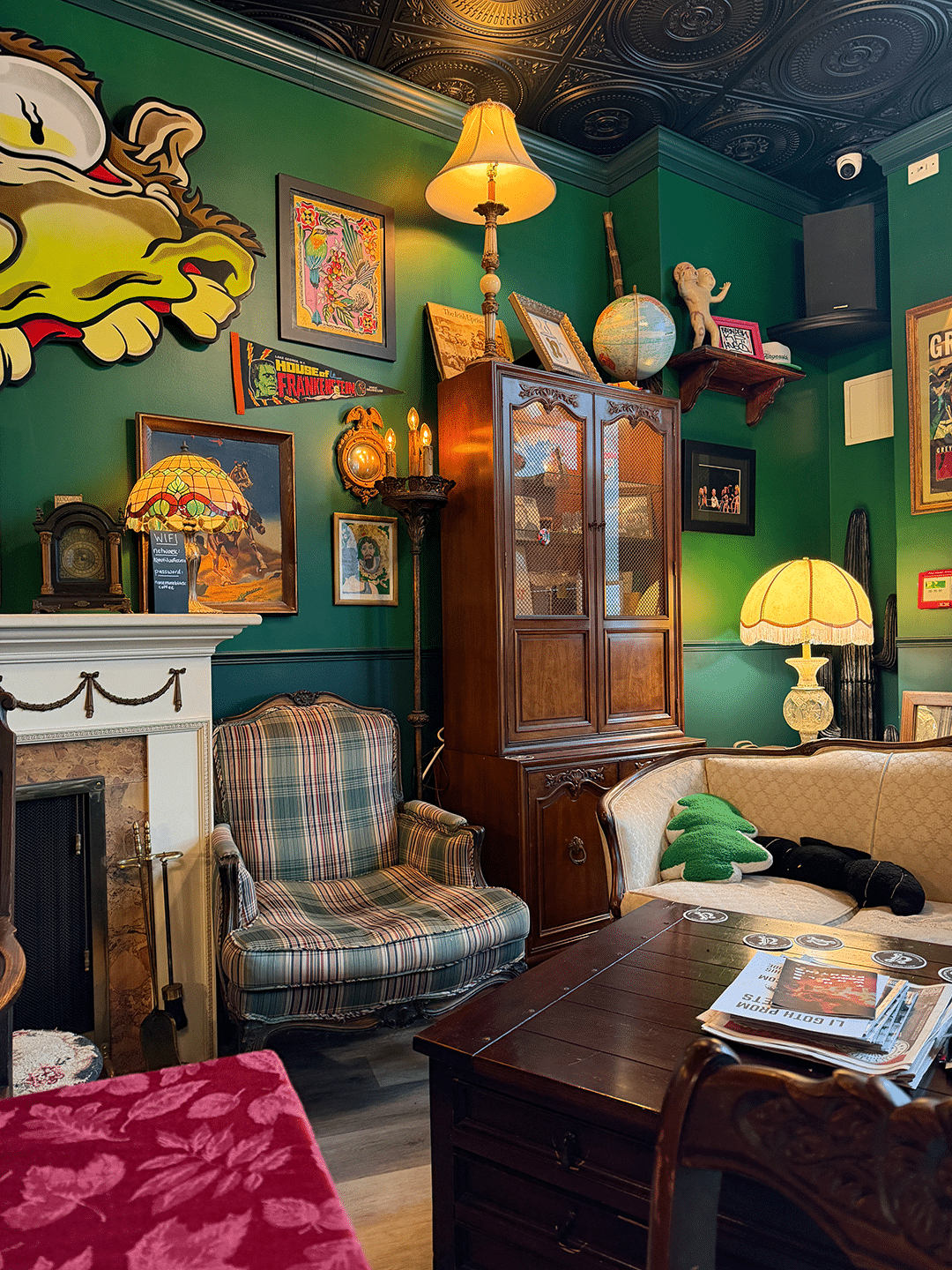 At the counter, a strip of hunter green peeks through the doorway as you wait for your order. “Take a seat,” the barista waves toward a zigzag hallway that pulls you in.