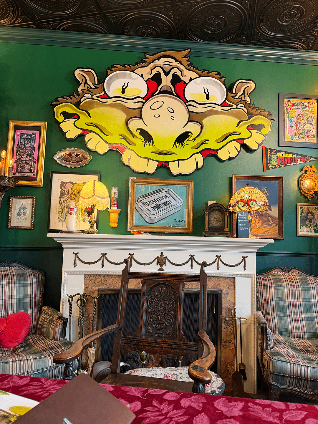 The space opens up into something that feels lifted straight out of Alice in Wonderland – unexpected, whimsical, and completely its own. Every chair is different. Tall, short, ornate, simple, cushioned, carved. Each table shifts in size and texture – velvet, wood, glass, linen.
