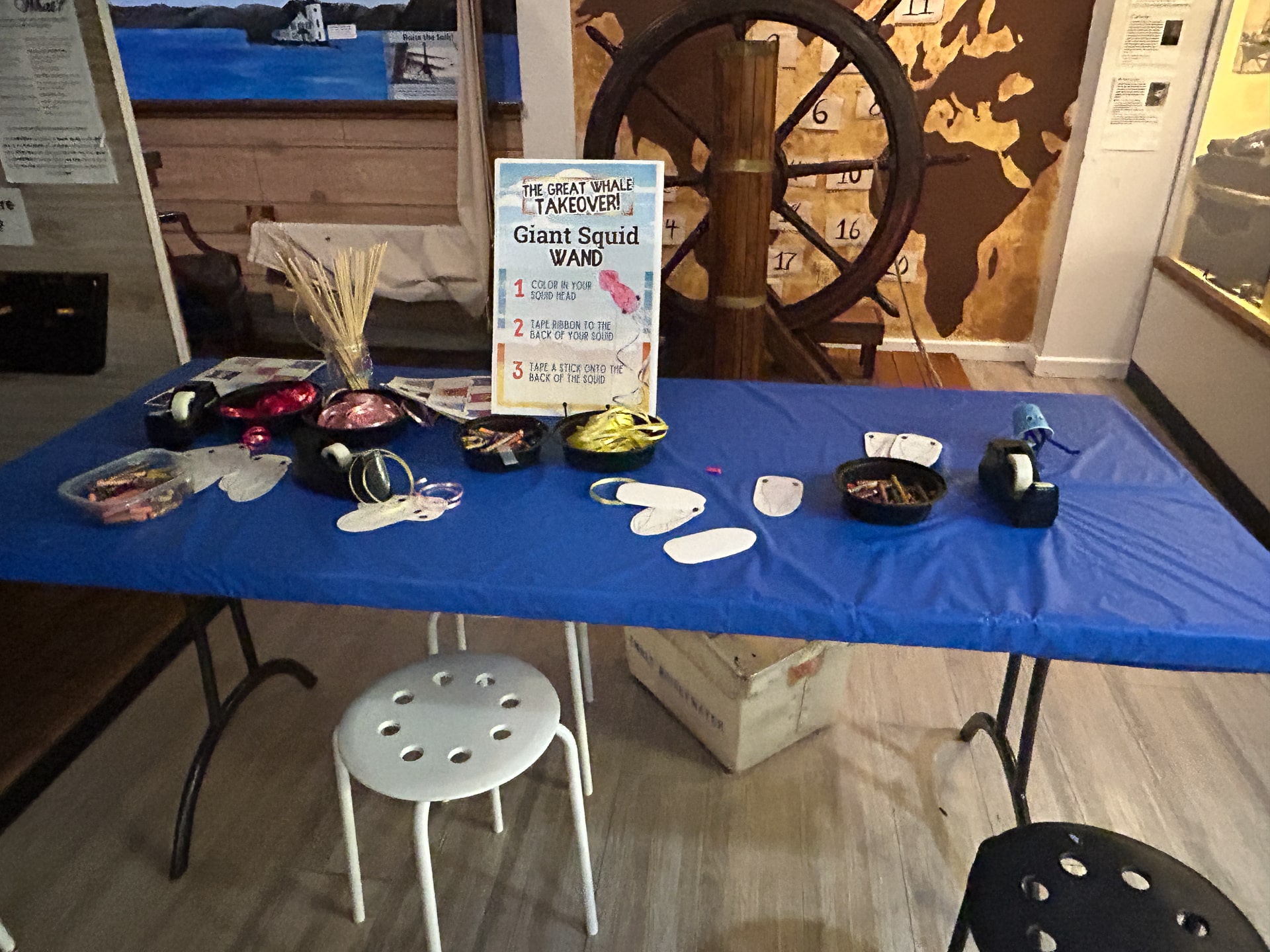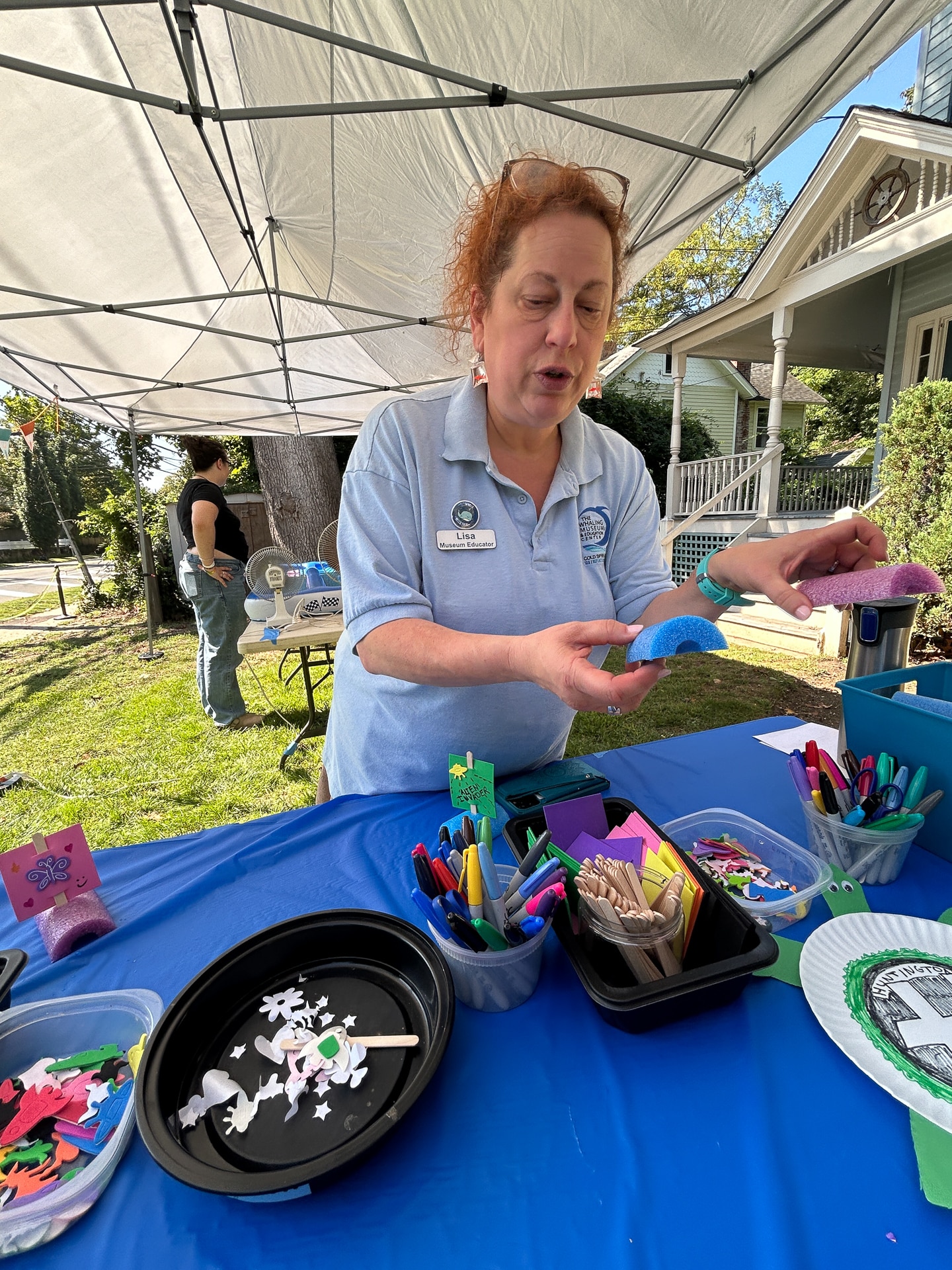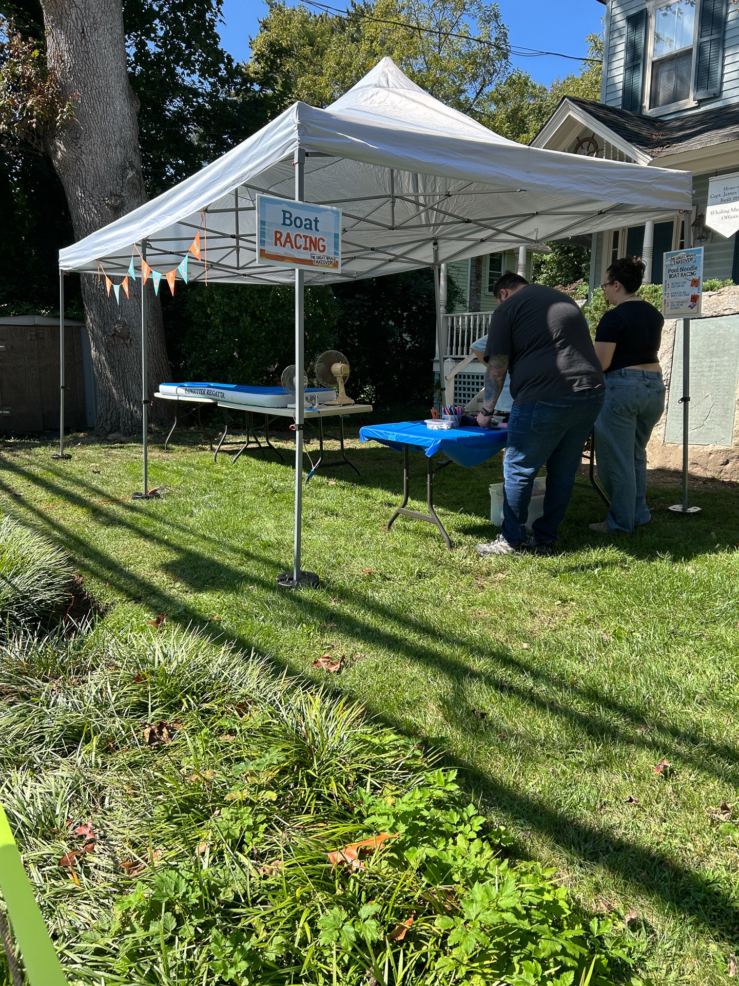 Harpoon Throwing (pool noodle) for “blubber” (container of slime) was outside behind the Museum where a Museum Educator held an authentic whaling harpoon for guests to feel and hold. The Boat Racing tent next door had guests building custom boats with pool noodle pieces, popsicle sticks, and foam shapes that they could race in 2 lanes of an inflatable pool. Yes, Diane’s boat crushed June’s for well-earned bragging rights.