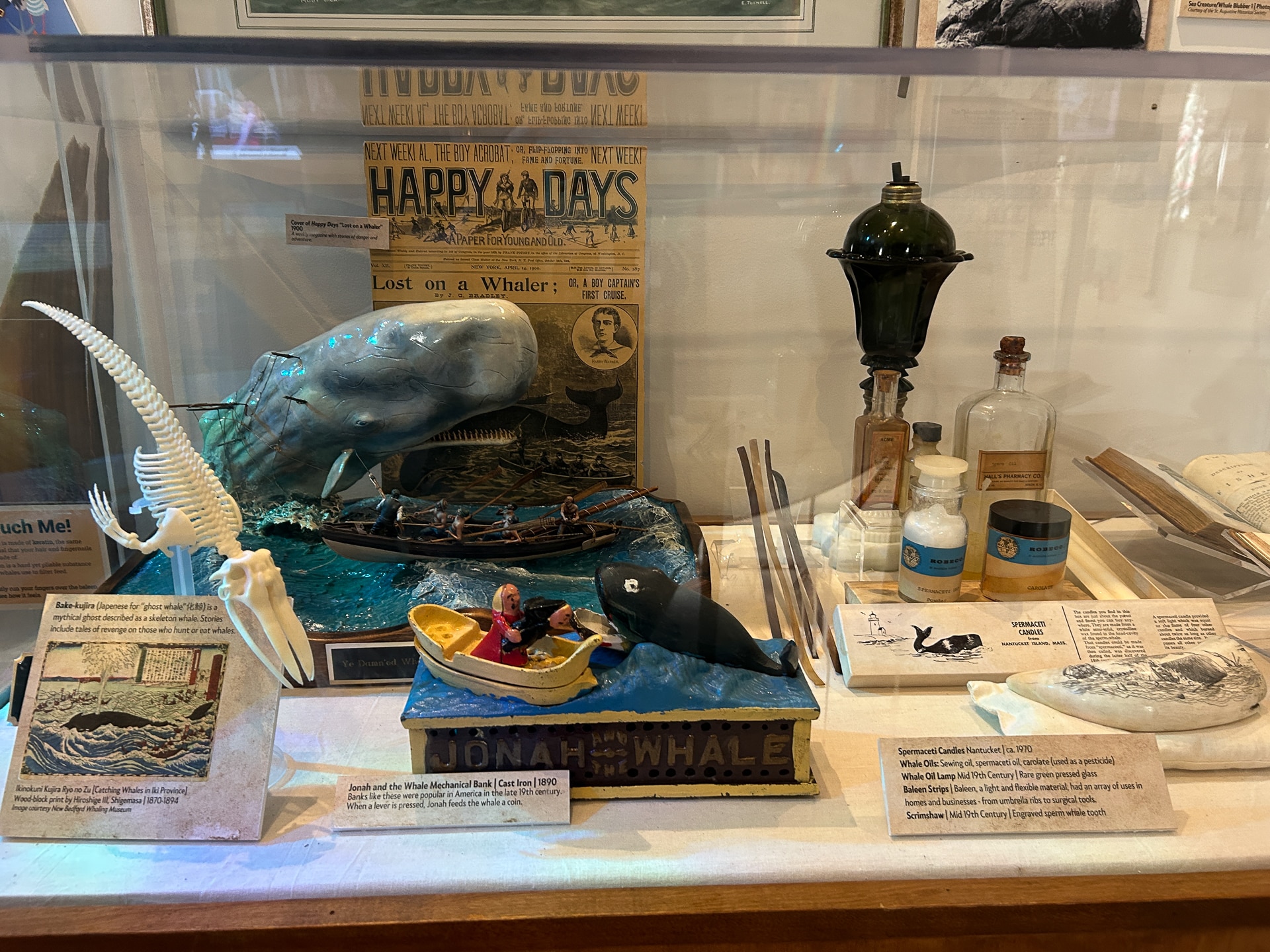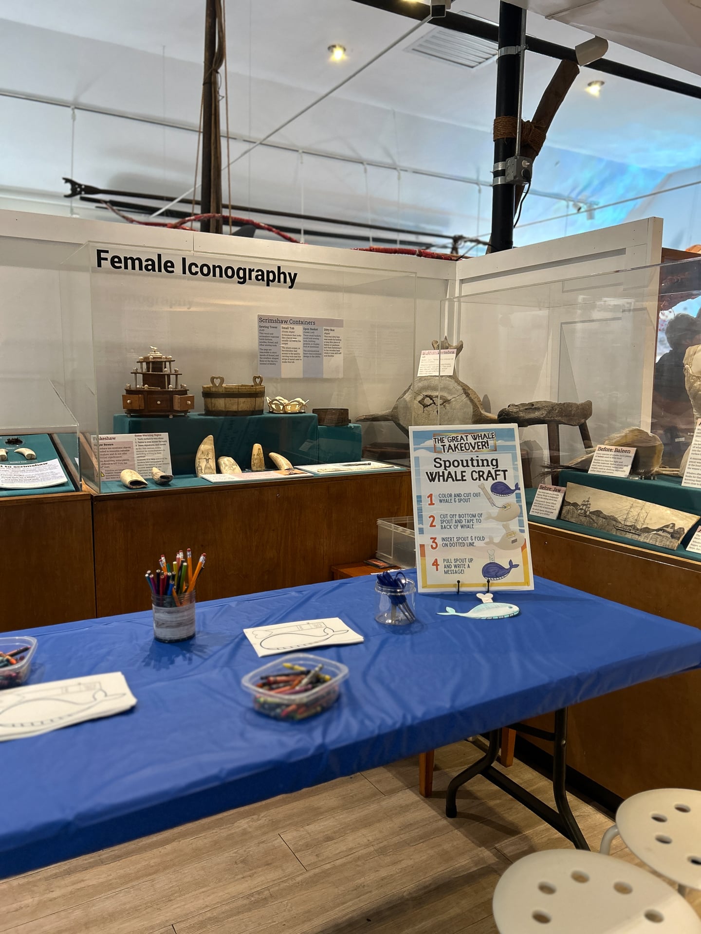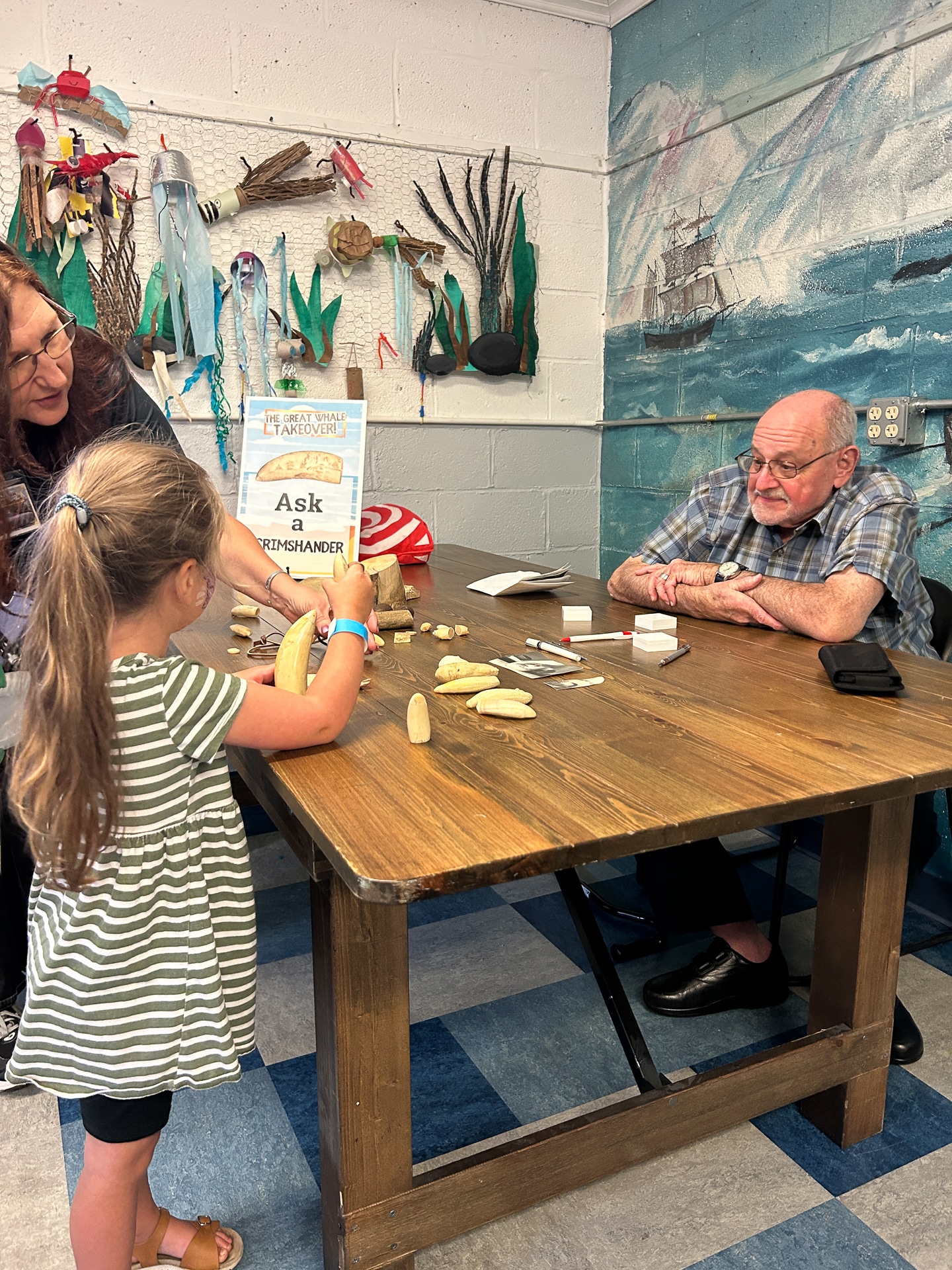 The Great Whale Takeover! event led guests to explore every inch of the Whaling Museum and Education Center’s property with entertaining and interesting activities for all ages at every turn. Craft tables throughout the Museum’s permanent exhibits invited guests to make giant squid, whale, turtle and octopus sea creatures. Nomi Dayan, the Museum’s Executive Director, led a presentation with “Fun Facts” about whales throughout the afternoon. The Scrimshaw Artisan – and Museum Board Member – Mark Green was fascinating to speak to, sharing how he traded one carved whale’s tooth for 4 or 5 larger teeth from a New York City business on the docks over 50 years ago while in art school at Pratt Institute. The 1972 Marine Mammal Protection Act (MMPA) prohibits the sale and transport of marine mammal products.