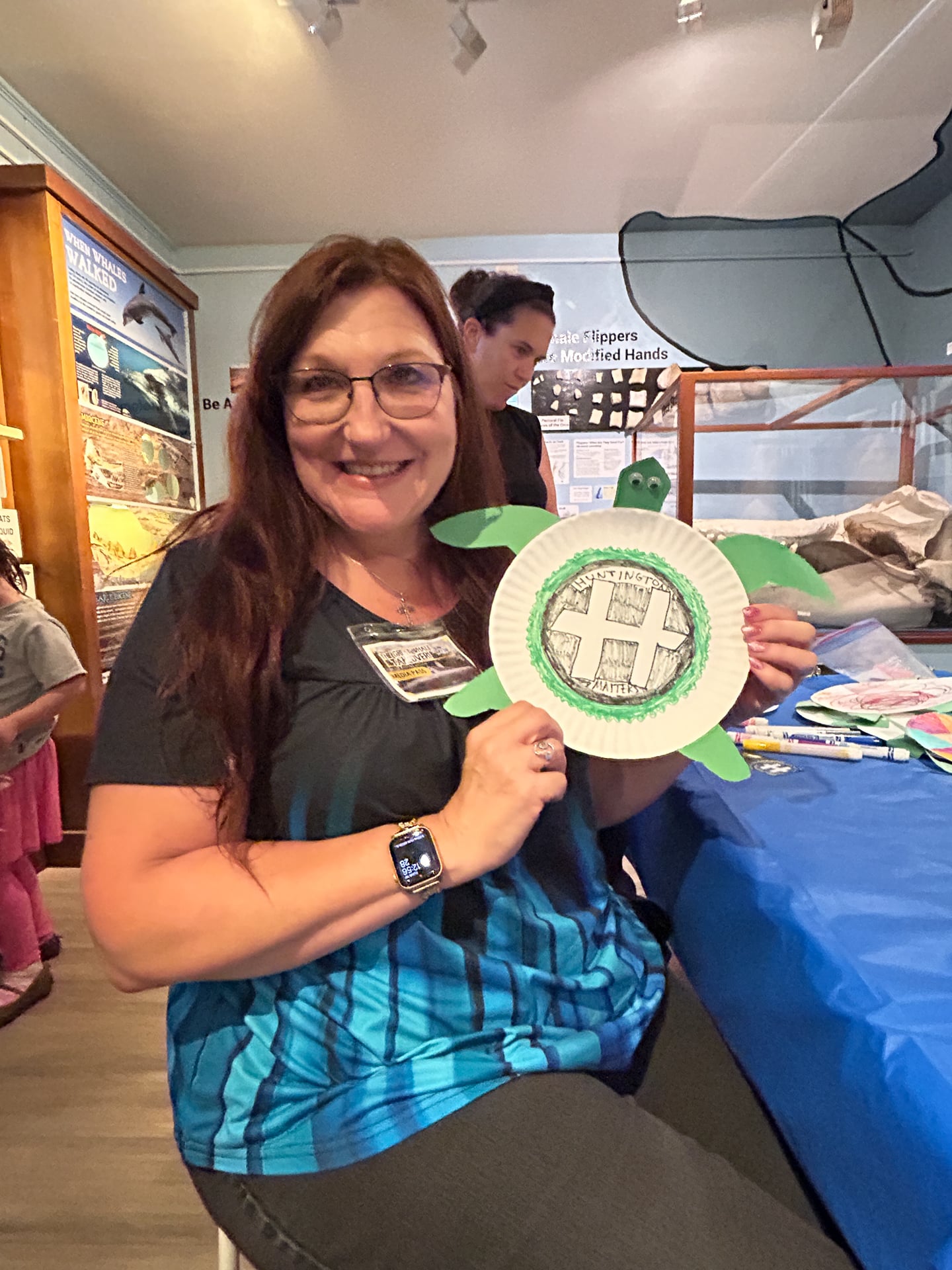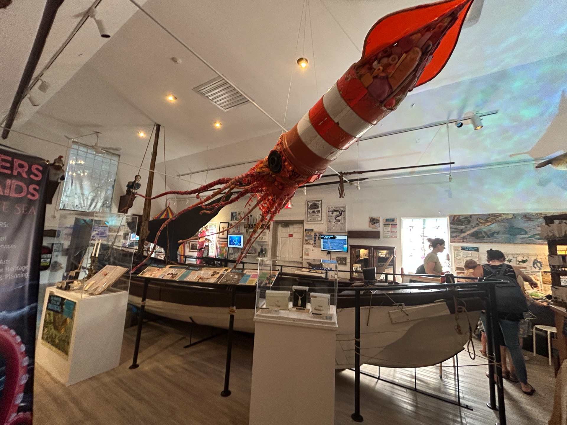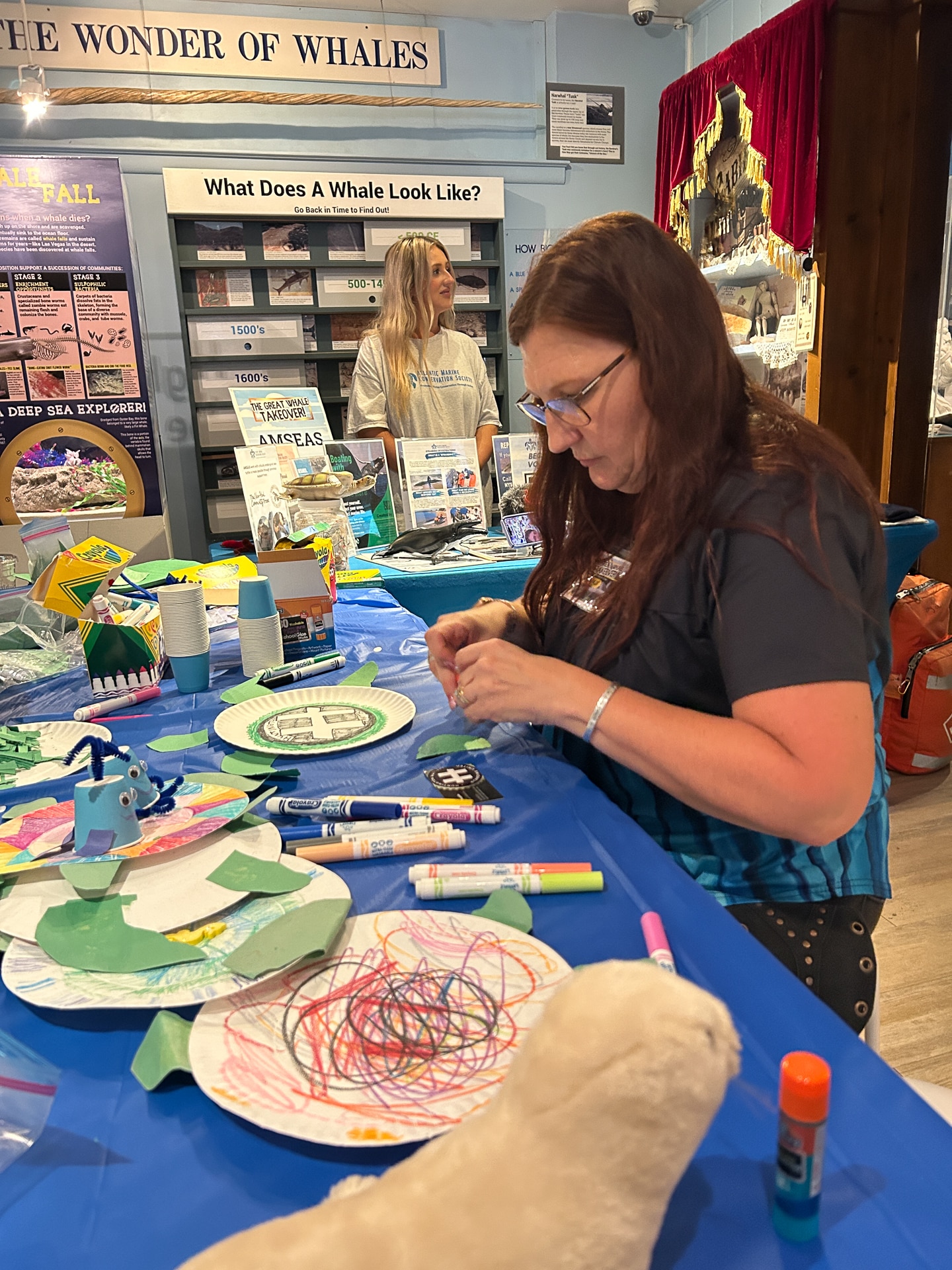 The Great Whale Takeover! event led guests to explore every inch of the Whaling Museum and Education Center’s property with entertaining and interesting activities for all ages at every turn. Craft tables throughout the Museum’s permanent exhibits invited guests to make giant squid, whale, turtle and octopus sea creatures. Nomi Dayan, the Museum’s Executive Director, led a presentation with “Fun Facts” about whales throughout the afternoon. The Scrimshaw Artisan – and Museum Board Member – Mark Green was fascinating to speak to, sharing how he traded one carved whale’s tooth for 4 or 5 larger teeth from a New York City business on the docks over 50 years ago while in art school at Pratt Institute. The 1972 Marine Mammal Protection Act (MMPA) prohibits the sale and transport of marine mammal products.