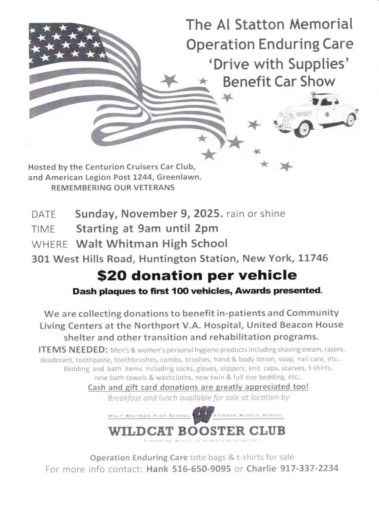 SOUTH HUNTINGTON, NY – “Hosted by the Centurion Cruisers Car Club and American Legion Post 1244. Hundreds of cars will be there to look at and admire while supporting a great cause.