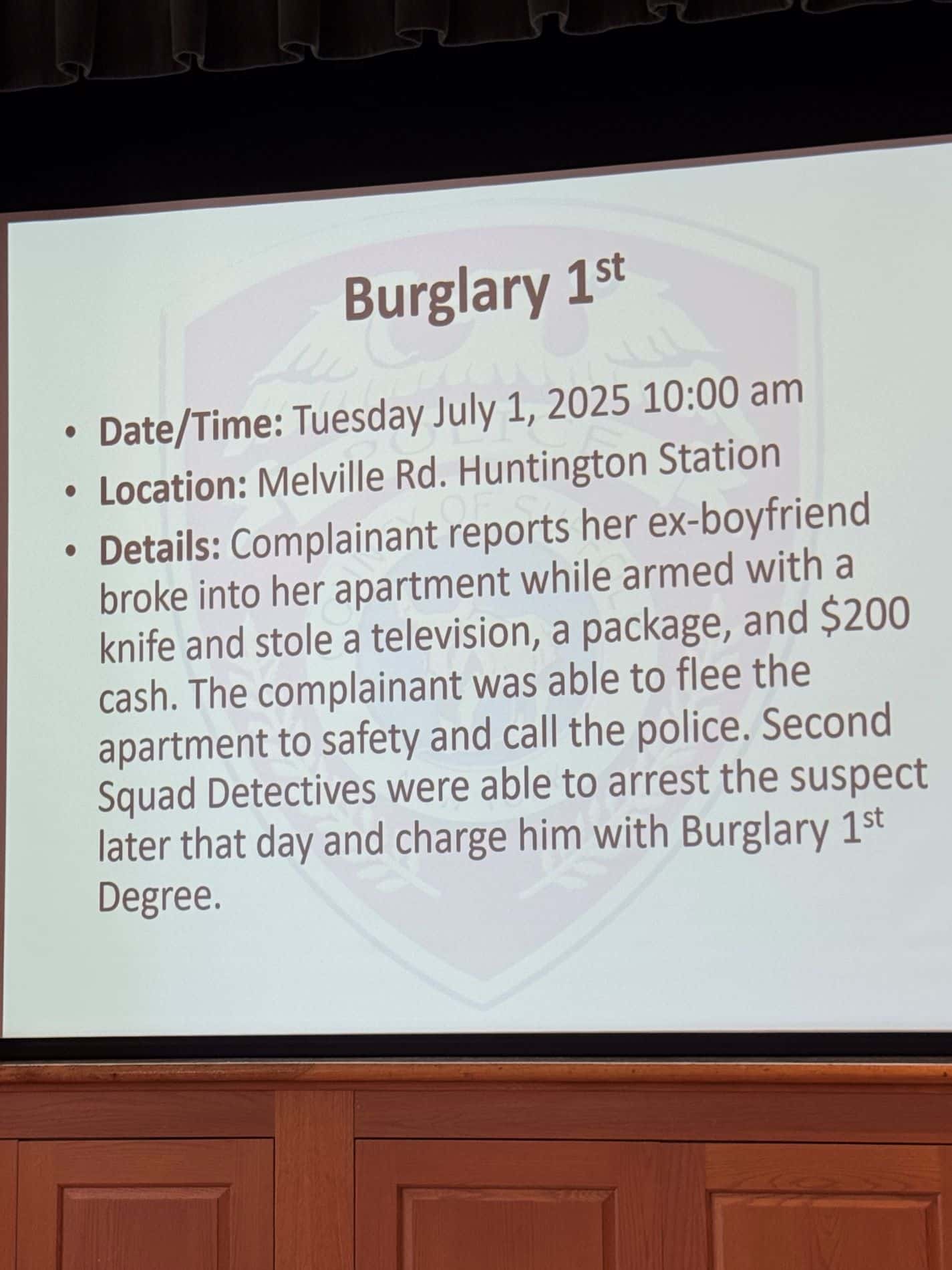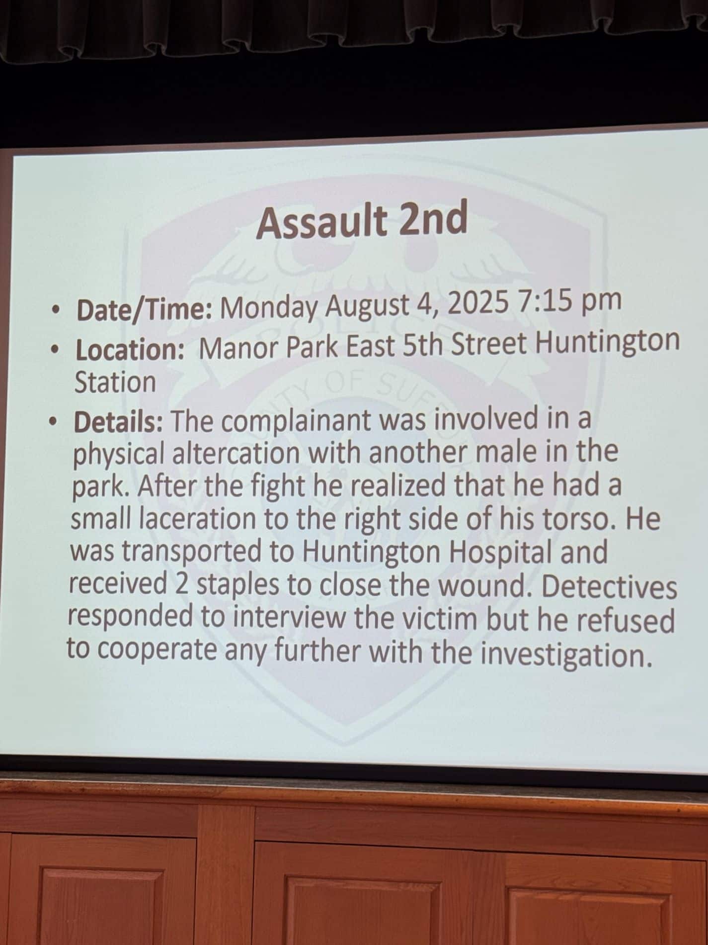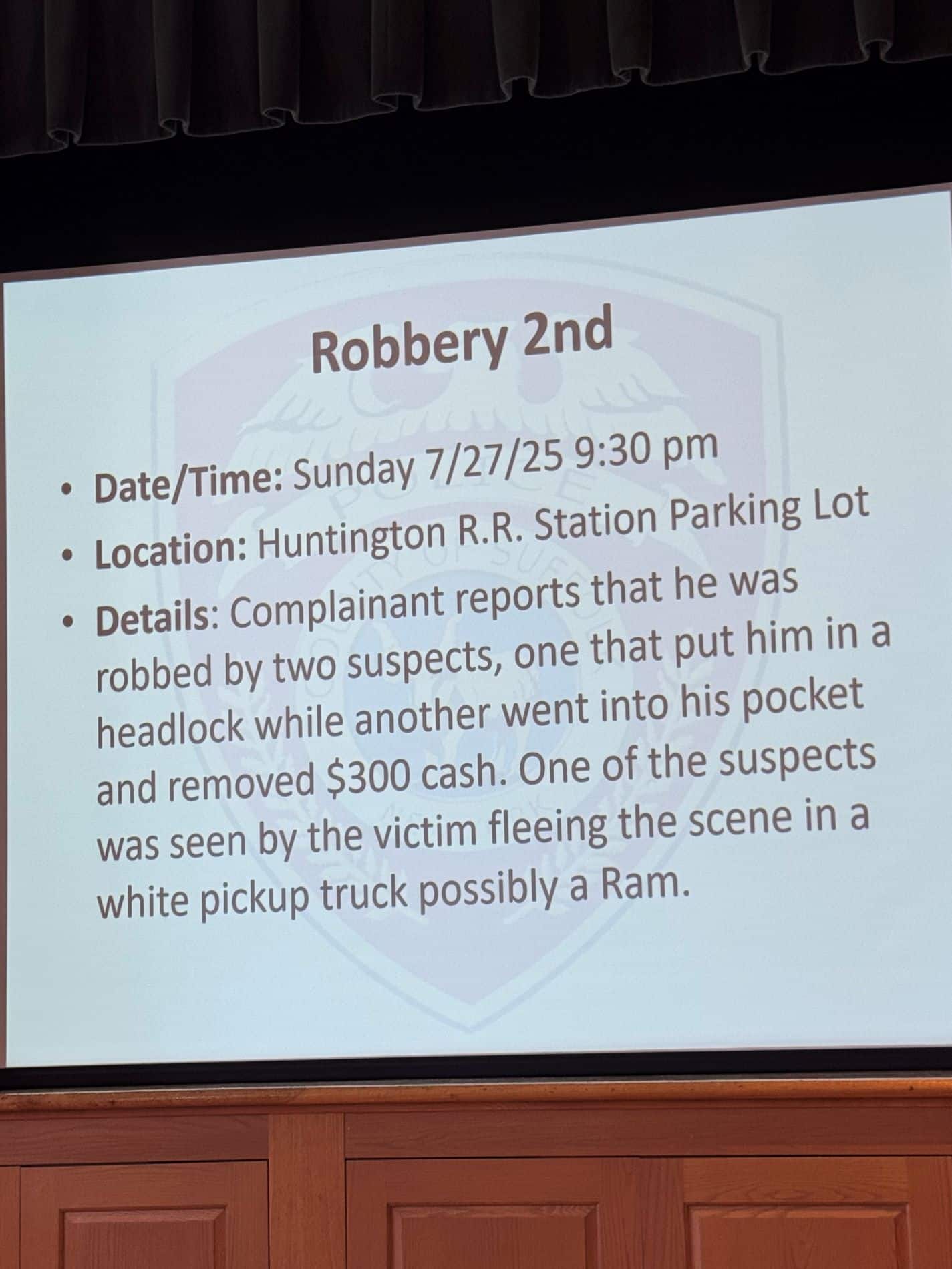 Suffolk County Police Department 2nd Precinct Monthly Community Meeting – September 2, 2025, 10:00am at Harborfields Public Library, 31 Broadway, Greenlawn, recorded by Huntington Matters. Inspector Kevin Williams gives an update on crime and policing activity for the 2nd Precinct for July and August 2025 for the Town of Huntington, New York.