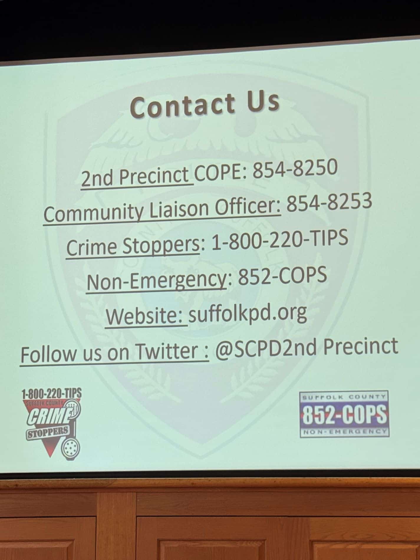 🚓 CONTACT SUFFOLK COUNTY POLICE DEPARTMENT: 2ND Precinct COPE: (631) 854-8250 Community Liaison Officer: (631) 854-8253 Crime Stoppers: 1-900-220-TIPS Non-Emergency: (631) 852-COPS Website: https://suffolkpd.org/ Facebook: Suffolk County Police Department Second Precinct. Instagram: @scpd2ndprecinct. Twitter: @SCPD2nd Precinct.