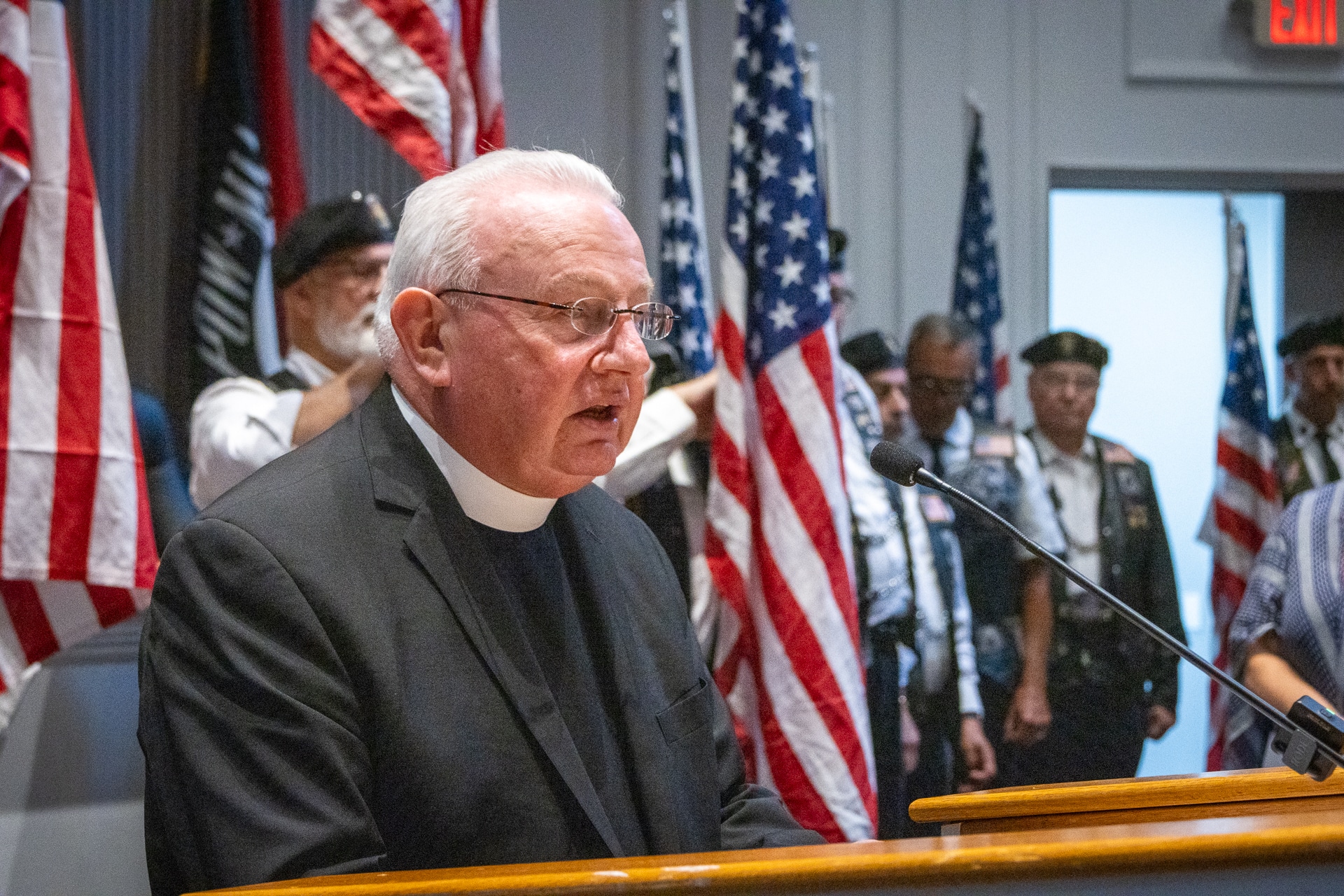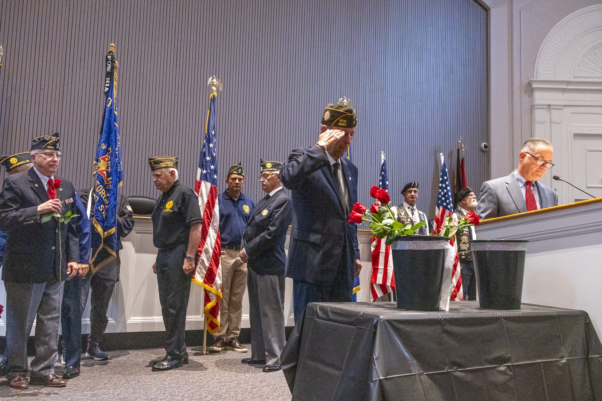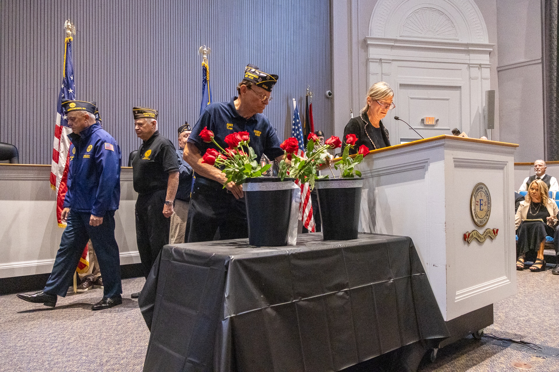 The Invocation was given by Monsignor Steven Camp, from the Church of St. Patrick in Huntington, followed by the reading of the names of those lost. Each name was read, a bell rang, and a red rose was placed in their memory by the Veterans Advisory Board Members.