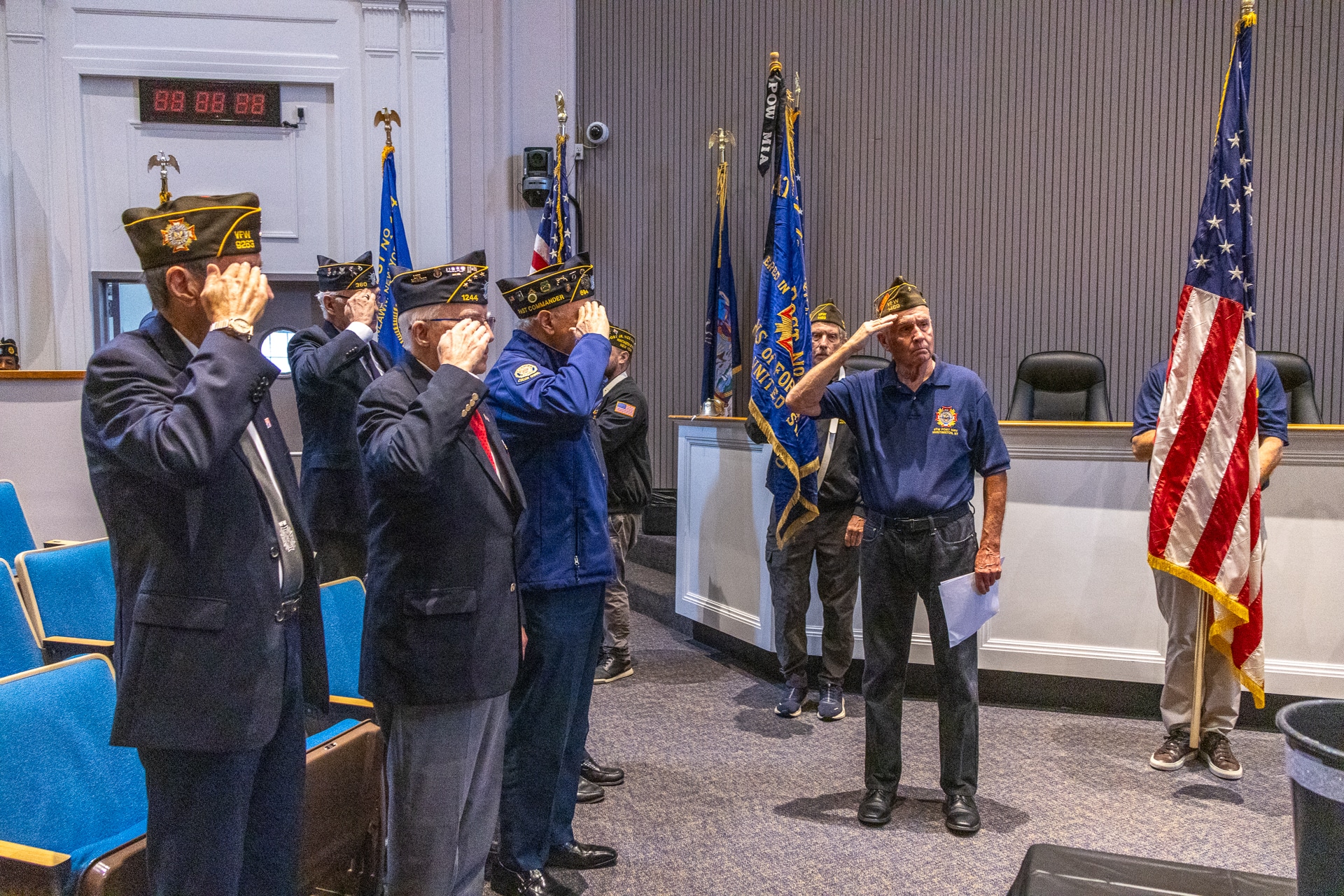The Color Guards lined the walls of the Huntington Town Board room while Supervisor Ed Smyth led us in the Pledge of Allegiance, followed by Louis DiLeo, from the United States Coast Guard Auxiliary Band, who sang The National Anthem.