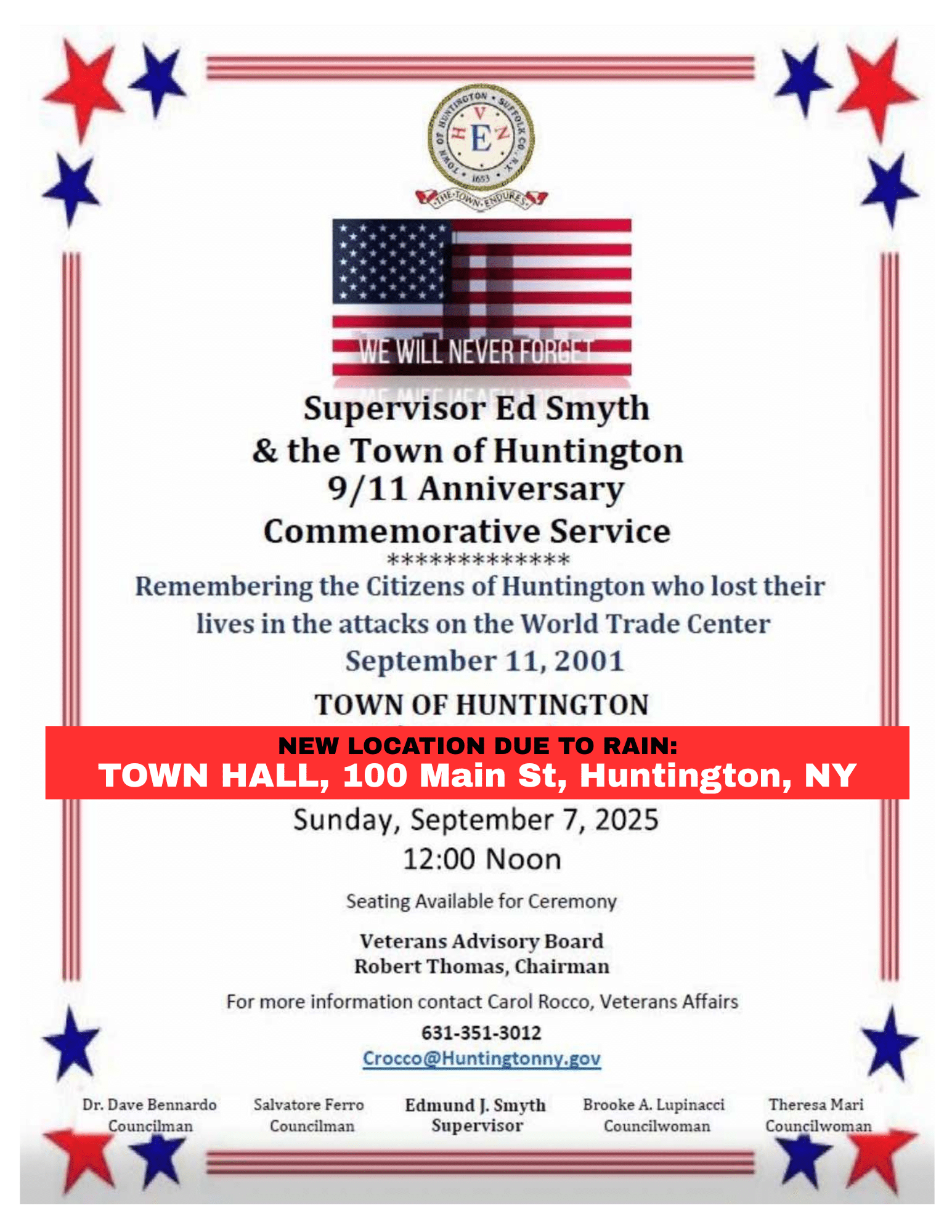 HUNTINGTON, NY – On Sunday, September 7, 2025 family members, friends, elected officials and community members gathered together for the Town of Huntington’s 23rd Annual 9/11 Anniversary Commemorative Service where we honored and remembered the 43 men and women from Huntington who lost their lives on September 11, 2001.